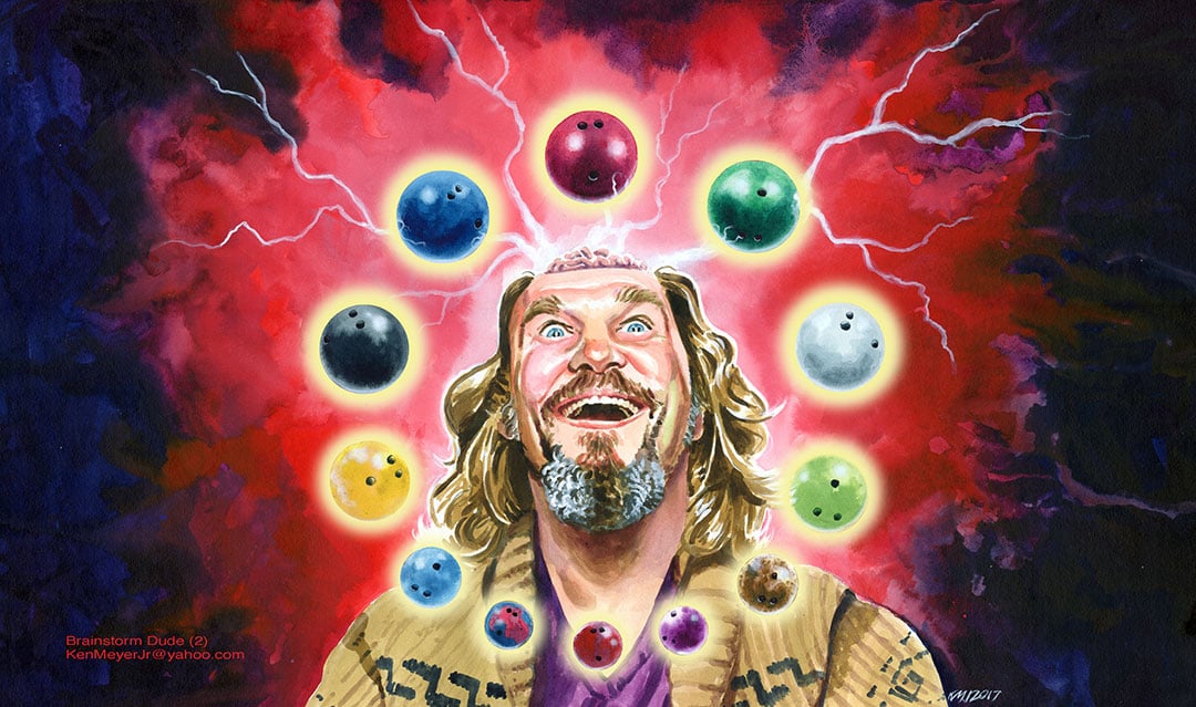 A mashup of not one, but TWO versions of the Magic card, Brainstorm, and Jeff Bridges character from the crazy film, The Big Lebowski! Version 2, now with more balls!