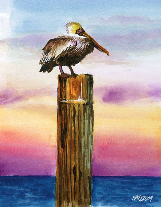 A lonely pelican standing watch, ink on illustration board, 7.5 x 10.