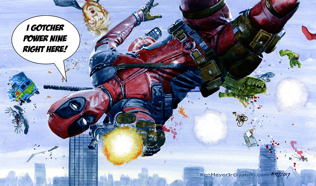 This is my Deadpool mat, obviously referring both to his nine millimeter AND the "power nine" Magic cards. Available also without text and without text AND Trump!