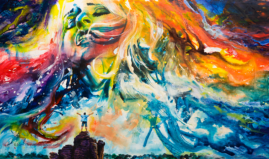 A brand new playmat, featuring a very large newish painting of mine. A bombardment of color for your bland playing table!