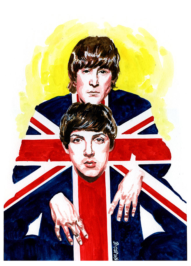 A new painting of John Lennon and Paul McCartney, from early Beatles period. Ink on illustration board. 9 x 12 inches.