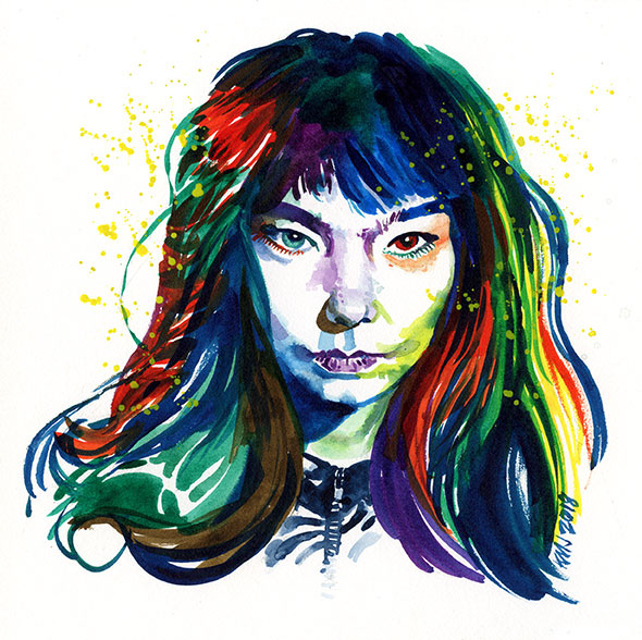 A new painting of Bjork. Ink on illustration board. 8 x 8 inches.