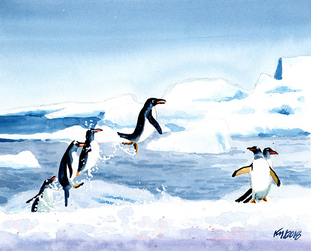 A fun piece with some frolicking penguins. Ink on illustration board, 9 x 7.