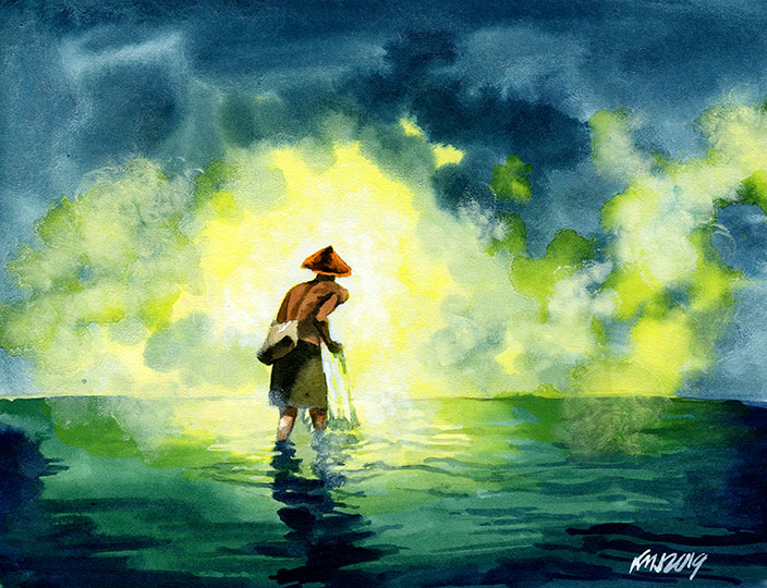Asian fisherman in a mysterious setting, 10 x 7.5.