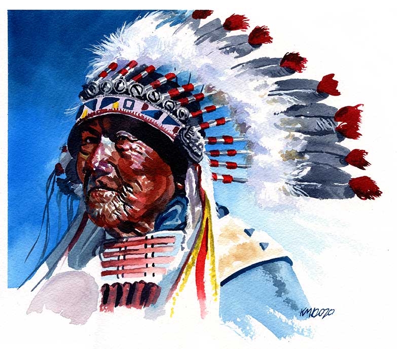 A colorful rendition of a chief, ink on 300 lb watercolor paper, 10 x 9.