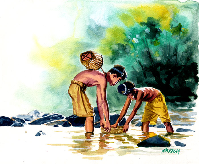 A couple of Asian kids looking for treasure. Ink on illustration board, 9.5 x 8.