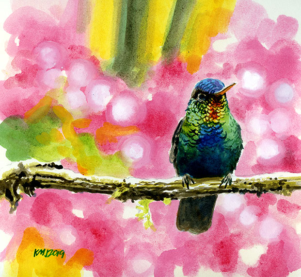 A colorful hummingbird on an even more colorful background, ink on illustration board, 9 x 9.