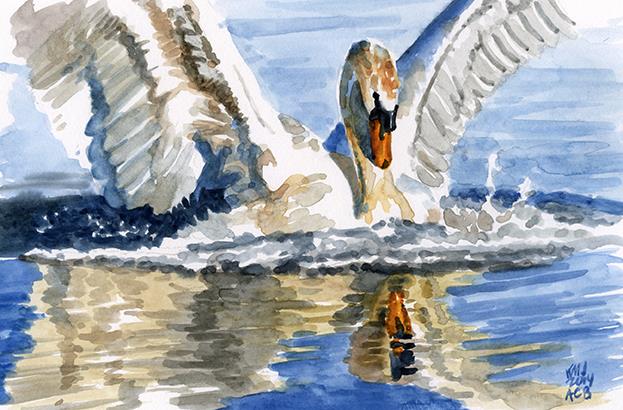 A majestic goose flapping it's wings, watercolor on illustration board, 7 x 5.
